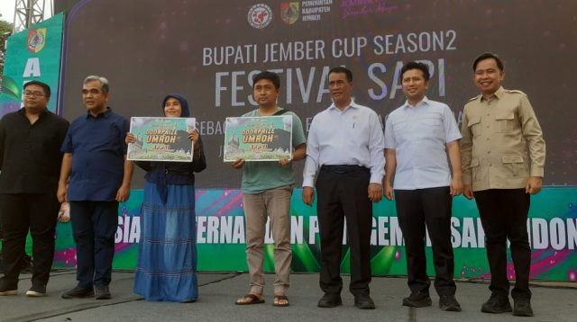 Dua warga Jember foto bersama Ketua MPR RI, Wakil Gubernur Jatim dan Bupati Jember usai mendapatkan Doorprize Umroh dari Panitia Kontes Sapi APPSI JATIM. Foto: tjahyadi ermawan